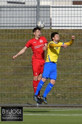 Fussball, Bezirksliga Ost, SG Weitefeld-Langenbach (rot) vs. SG Mueschenbach-Hachenburg (gelb/blau), 13.03.2022 |