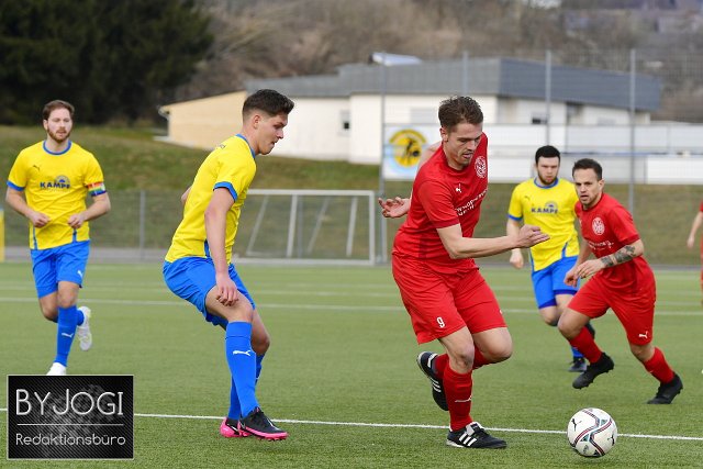 Fussball, Bezirksliga Ost, SG Weitefeld-Langenbach (rot) vs. SG Mueschenbach-Hachenburg (gelb/blau), 13.03.2022 |