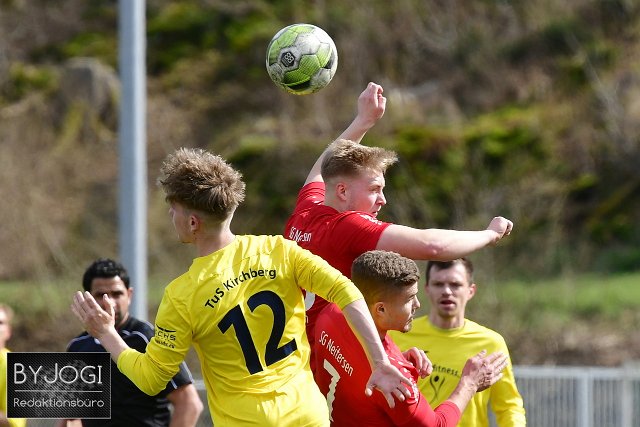 Fussball, Rheinlandliga, SG Neitersen-Altenkirchen (rot/blau) vs. TuS Kirchberg (gelb), 10.04.2022 |