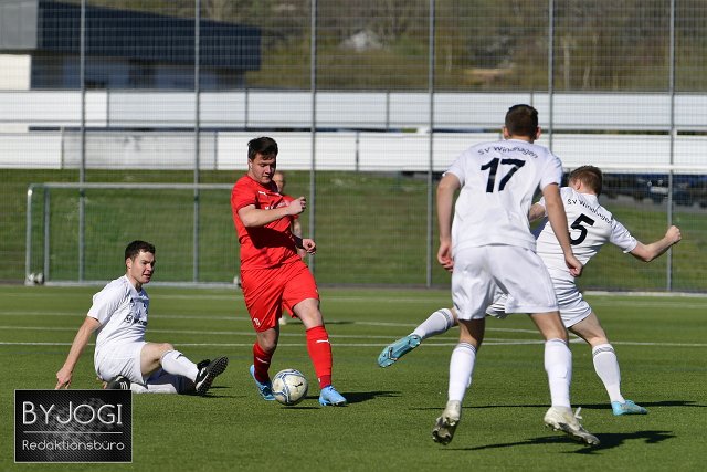 Fussball, Bezirksliga Ost, SG Weitefeld (rot) vs. SC Windhagen (weiß), 16.04.2022 |