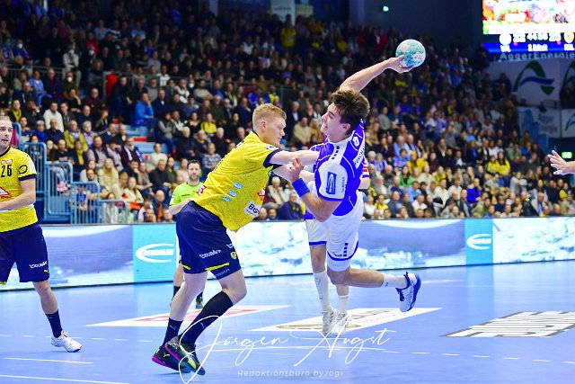 Liqui Moly Handball, 1. Bundesliga, 2022-2023, Maenner, VfL Gummersbach vs Rhein-Neckar Loewen, 15. Spieltag, 01.12.2022Oern Ymir Gislason (Rhein-Neckar Loewen / #33) gegen Julian Koester (VfL Gummersbach / #7) Liqui Moly Handball, 1. Bundesliga 2022/2023, Maenner, VfL Gummersbach vs Rhein-Neckar Loewen, 15. Spieltag, 01.12.2022 Foto: Eibner-Pressefoto/Juergen Augst |