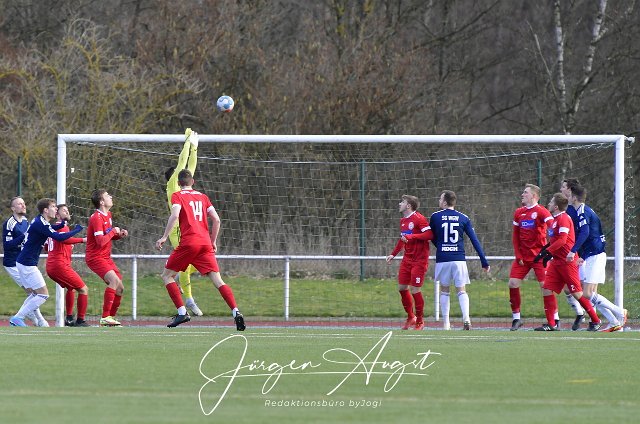 Fussball, Bezirksliga Fussball- BezirksligaOst, SG Berod-Wahlrod-Lautzert-Oberdreis (rot) vs. SG Westerburg-Gemuenden-Willmenrod (blau/weiss), 26.02.2023 |