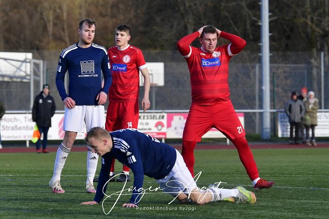 Fussball, Bezirksliga Fussball- BezirksligaOst, SG Berod-Wahlrod-Lautzert-Oberdreis (rot) vs. SG Westerburg-Gemuenden-Willmenrod (blau/weiss), 26.02.2023 |
