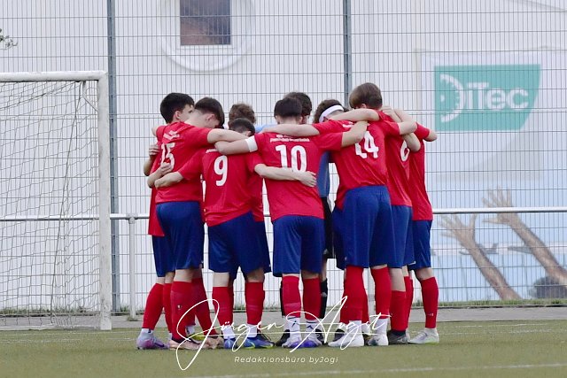 Fussball, Rheinlandliga A-Junioren, JSG Neitersen (rot/bau) vs. FC Rot-Weiss Koblenz (schwarz), 21.04.2023 |