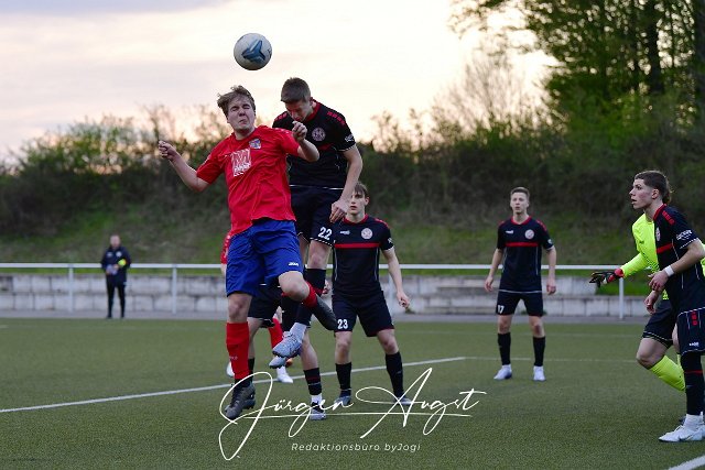Fussball, Rheinlandliga A-Junioren, JSG Neitersen (rot/bau) vs. FC Rot-Weiss Koblenz (schwarz), 21.04.2023 |