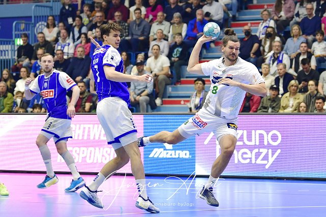 Erik Schmidt (HSG Wetzlar / #8) gegen Julian Koester (VfL Gummersbach / #7) Handball, 1 Bundesliga, VfL Gummersbach vs. HSG Wetzlar, 27. Spieltag, Schwalbe Arena Gummersbach, 23.04.2023 Foto: Eibner-Pressefoto/Juergen Augst |