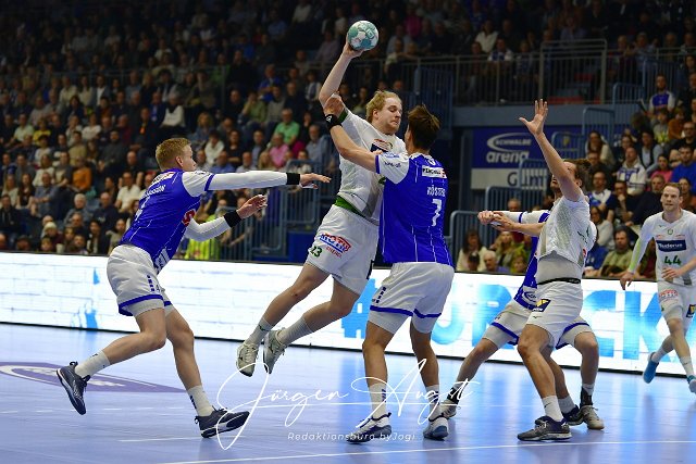 Magnus Fredriksen (HSG Wetzlar / #23) gegen Julian Koester (VfL Gummersbach / #7) Handball, 1 Bundesliga, VfL Gummersbach vs. HSG Wetzlar, 27. Spieltag, Schwalbe Arena Gummersbach, 23.04.2023 Foto: Eibner-Pressefoto/Juergen Augst |