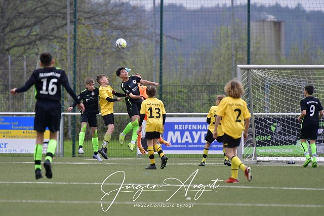 Fussball, Rheinlandliga D-Junioren, JSG Hammer Land - Niederhausen (schwarz) vs- TuS Koblenz (gelb-schwarz), 29.04.2023 |