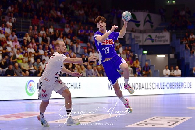 Giorgi Tskhovrebadze (VfL Gummersbach 19) gegen Tim Zechel (HC Erlangen 96) VfL Gummersbach vs. HC Erlangen, Handball, Bundesliga, 7. Spieltag, Saison 2023/24, 28.09.2023 Foto: Eibner-Pressefoto/Juergen Augst |