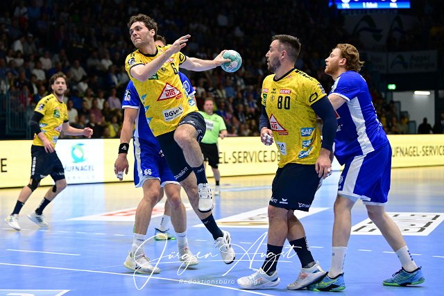 Niclas Kirkelokke (Rhein-Neckar Loewen 6) ist am Kreis durch Handball, 1 Bundesliga, VfL Gummersbach vs. Rhein Neckar Loewen, 32. Spieltag, Schwalbe Arena Gummersbach, 19.05.2024 Foto: Eibner-Pressefoto/Juergen Augst |