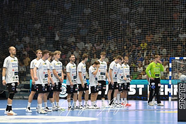 Die Mannschaft von Mors-Thy Handbold vor dem Rueckspiel in der EHF Qualifikation in der Schwalbe Arena in Gummersbach Handball, EHF European Handball Federation, 2024-2025, Qualifikation, Rueckspiel, VfL Gummersbach vs. Mors-Thy Handbold, Schwalbe Arena Gummersbach, .08.09.2024 Foto: Eibner-Pressefoto/Juergen Augst |