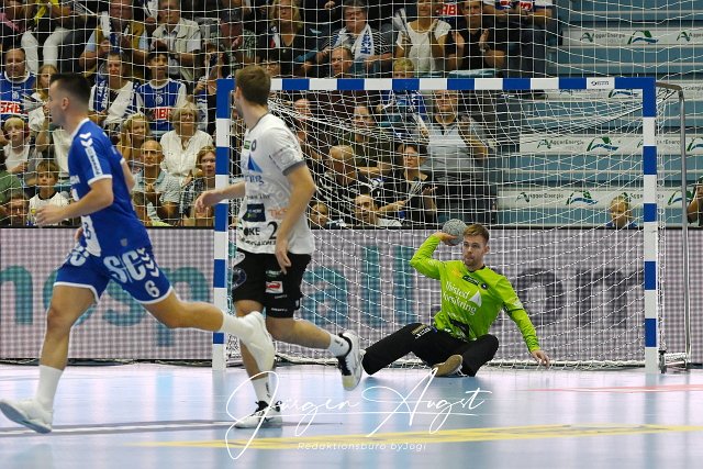 Svend Bro Rughave (Mors-Thy Handbold 30) sitzt geschlagen in seinem Tor Handball, EHF European Handball Federation, 2024-2025, Qualifikation, Rueckspiel, VfL Gummersbach vs. Mors-Thy Handbold, Schwalbe Arena Gummersbach, .08.09.2024 Foto: Eibner-Pressefoto/Juergen Augst |