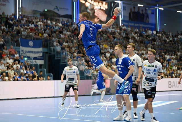 Herr der Luefte, Tilen Kodrin (VfL Gummersbach 5) Handball, EHF European Handball Federation, 2024-2025, Qualifikation, Rueckspiel, VfL Gummersbach vs. Mors-Thy Handbold, Schwalbe Arena Gummersbach, .08.09.2024 Foto: Eibner-Pressefoto/Juergen Augst |