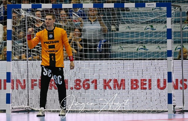 Neue Nummer 1 im Gummersbacher Tor Dominik Kuzmanovic (VfL Gummersbach 1) Handball, EHF European Handball Federation, 2024-2025, Qualifikation, Rueckspiel, VfL Gummersbach vs. Mors-Thy Handbold, Schwalbe Arena Gummersbach, .08.09.2024 Foto: Eibner-Pressefoto/Juergen Augst |