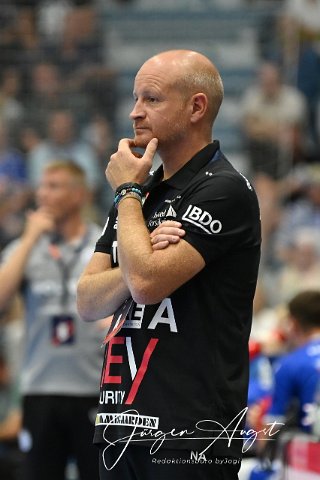 Nachdenklich Niels Agesen (Trainer Mors-Thy Handbold) Handball, EHF European Handball Federation, 2024-2025, Qualifikation, Rueckspiel, VfL Gummersbach vs. Mors-Thy Handbold, Schwalbe Arena Gummersbach, .08.09.2024 Foto: Eibner-Pressefoto/Juergen Augst |