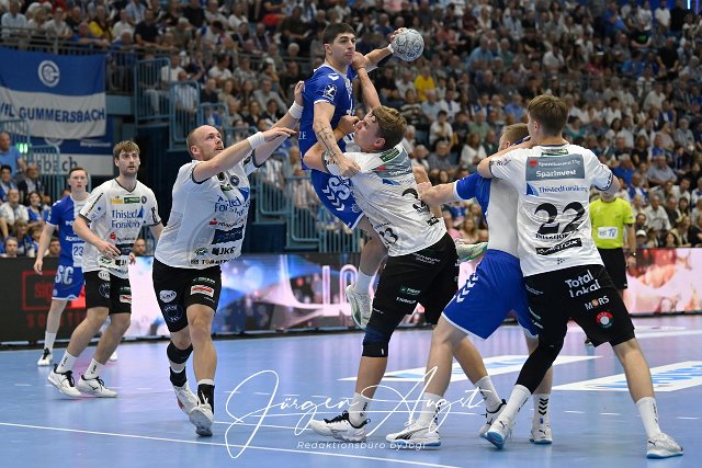 Giorgi Tskhovrebadze (VfL Gummersbach 19) gegen Henrik Toft Hansen (Mors-Thy Handbold 15) und Kasper Hasselager Didriksen (Mors-Thy Handbold 33) Handball, EHF European Handball Federation, 2024-2025, Qualifikation, Rueckspiel, VfL Gummersbach vs. Mors-Thy Handbold, Schwalbe Arena Gummersbach, .08.09.2024 Foto: Eibner-Pressefoto/Juergen Augst |
