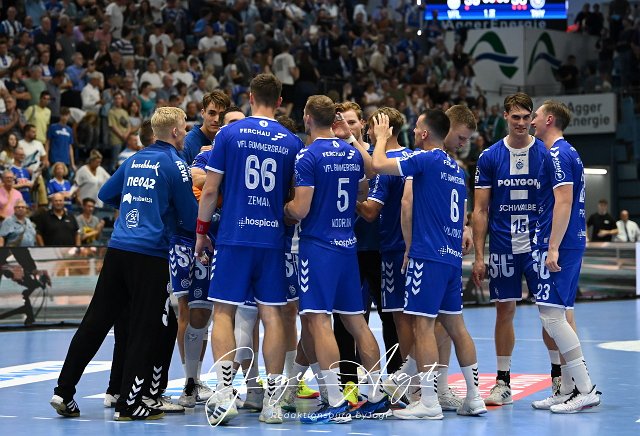 Jubel bei den Spielern des VfL Gummersbach ueber den Einzug in die Hauptrunde des EHF Pokal Handball, EHF European Handball Federation, 2024-2025, Qualifikation, Rueckspiel, VfL Gummersbach vs. Mors-Thy Handbold, Schwalbe Arena Gummersbach, .08.09.2024 Foto: Eibner-Pressefoto/Juergen Augst |