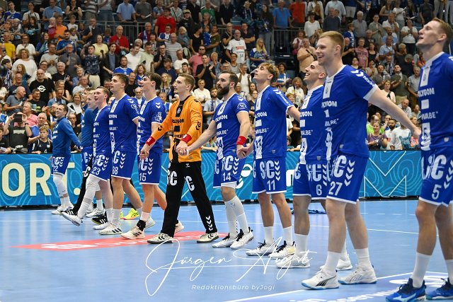 Die Spieler des VfL Gummersbach feiern den Einzug in die Hauptrunde des EHF Pokals Handball, EHF European Handball Federation, 2024-2025, Qualifikation, Rueckspiel, VfL Gummersbach vs. Mors-Thy Handbold, Schwalbe Arena Gummersbach, .08.09.2024 Foto: Eibner-Pressefoto/Juergen Augst |