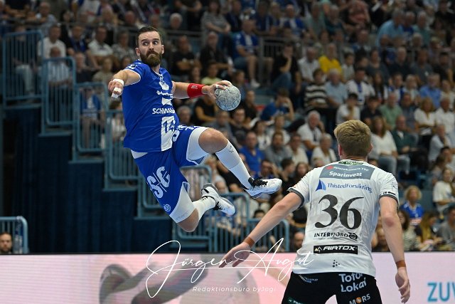 Teitur Einarsson (VfL Gummersbach 14) Handball, EHF European Handball Federation, 2024-2025, Qualifikation, Rueckspiel, VfL Gummersbach vs. Mors-Thy Handbold, Schwalbe Arena Gummersbach, .08.09.2024 Foto: Eibner-Pressefoto/Juergen Augst |