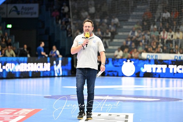 Der Hallensprechen in der Schwalbe Arena in Gummersbach Dirk Hartmann VfL Gummersbach vs. TBV Lemgo Lippe, Handball, Daikin 1. Bundesliga, 2. Spieltag, Spielzeit 2024-2025, Schwalbe Arena Gummersbach, 15,09.2024 Foto: Eibner-Pressefoto/Juergen Augst |