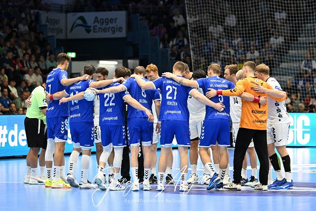 Die Teams des VfL Gummersbach und des TBV Lemgo Lippe vor dem Anwurf am Mittelkreis VfL Gummersbach vs. TBV Lemgo Lippe, Handball, Daikin 1. Bundesliga, 2. Spieltag, Spielzeit 2024-2025, Schwalbe Arena Gummersbach, 15,09.2024 Foto: Eibner-Pressefoto/Juergen Augst |