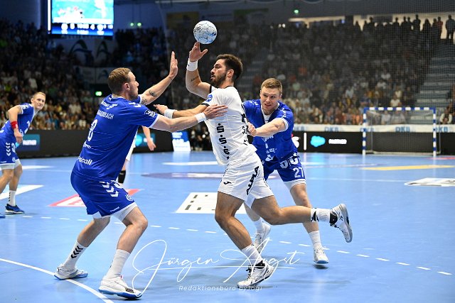 Tim Suton (TBV Lemgo Lippe 23) gegen Lukas Blohme (VfL Gummersbach 8) VfL Gummersbach vs. TBV Lemgo Lippe, Handball, Daikin 1. Bundesliga, 2. Spieltag, Spielzeit 2024-2025, Schwalbe Arena Gummersbach, 15,09.2024 Foto: Eibner-Pressefoto/Juergen Augst |