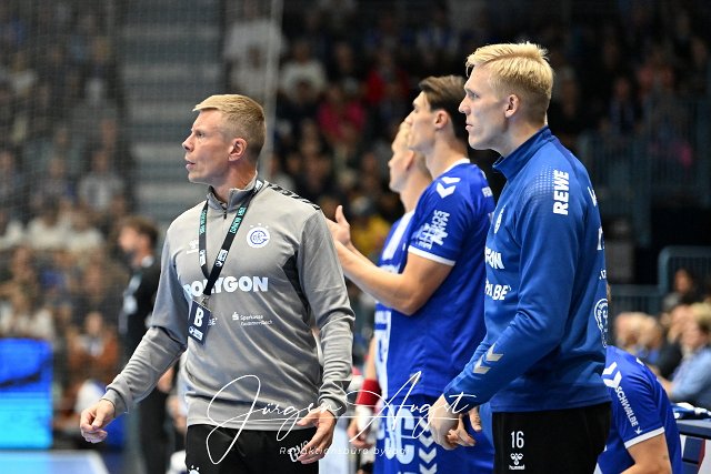 Gudjon Valur Sigurdsson (VfL Gummersbach Trainer) und Bertram Obling (VfL Gummersbach 16) schauen entsetzt von der Bank VfL Gummersbach vs. TBV Lemgo Lippe, Handball, Daikin 1. Bundesliga, 2. Spieltag, Spielzeit 2024-2025, Schwalbe Arena Gummersbach, 15,09.2024 Foto: Eibner-Pressefoto/Juergen Augst |