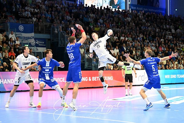 Niels Gerardus Versteijnen (TBV Lemgo Lippe 25) mit einem Wurf aus dem Rueckraum gegen Stepan Zeman (VfL Gummersbach 66) VfL Gummersbach vs. TBV Lemgo Lippe, Handball, Daikin 1. Bundesliga, 2. Spieltag, Spielzeit 2024-2025, Schwalbe Arena Gummersbach, 15,09.2024 Foto: Eibner-Pressefoto/Juergen Augst |
