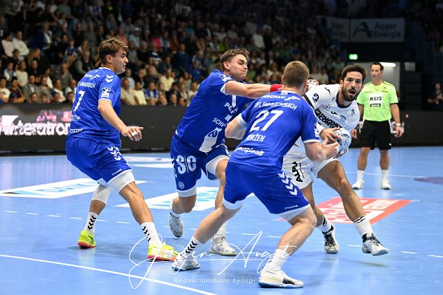 Tim Suton (TBV Lemgo Lippe 23) gegen Kristjan Horzen (VfL Gummersbach 27 ) und Stepan Zeman (VfL Gummersbach 66) VfL Gummersbach vs. TBV Lemgo Lippe, Handball, Daikin 1. Bundesliga, 2. Spieltag, Spielzeit 2024-2025, Schwalbe Arena Gummersbach, 15,09.2024 Foto: Eibner-Pressefoto/Juergen Augst |