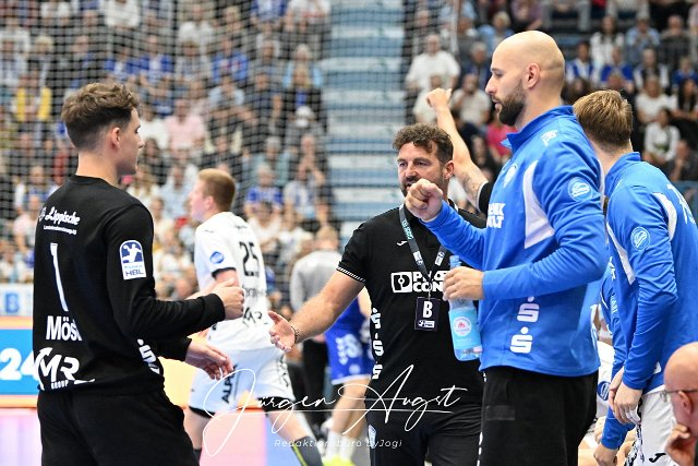 Florian Kehrmann (TBV Lemgo Lippe Trainer) und Urh Kastelic (TBV Lemgo Lippe 99) gratulieren Constantin Moestl (TBV Lemgo Lippe 1) VfL Gummersbach vs. TBV Lemgo Lippe, Handball, Daikin 1. Bundesliga, 2. Spieltag, Spielzeit 2024-2025, Schwalbe Arena Gummersbach, 15,09.2024 Foto: Eibner-Pressefoto/Juergen Augst |