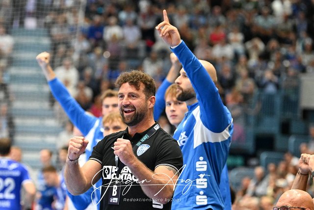 Florian Kehrmann (TBV Lemgo Lippe Trainer) jubelt mit geballten Faeusten VfL Gummersbach vs. TBV Lemgo Lippe, Handball, Daikin 1. Bundesliga, 2. Spieltag, Spielzeit 2024-2025, Schwalbe Arena Gummersbach, 15,09.2024 Foto: Eibner-Pressefoto/Juergen Augst |