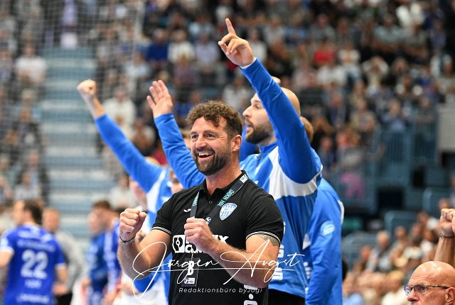 Florian Kehrmann (TBV Lemgo Lippe Trainer) bejubelt den Auswaertssieg beim VfL Gummersbach VfL Gummersbach vs. TBV Lemgo Lippe, Handball, Daikin 1. Bundesliga, 2. Spieltag, Spielzeit 2024-2025, Schwalbe Arena Gummersbach, 15,09.2024 Foto: Eibner-Pressefoto/Juergen Augst |