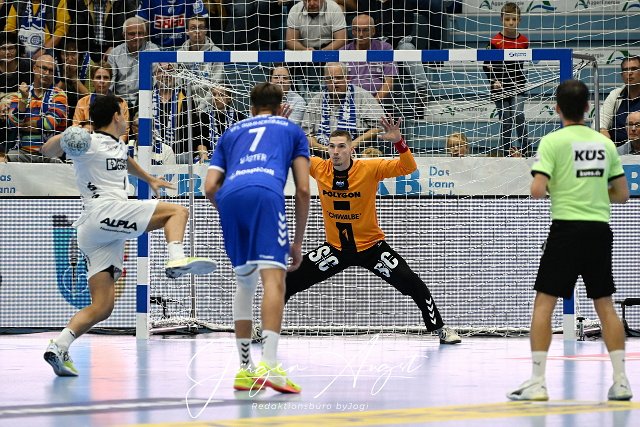 7 Meter Duell Dominik Kuzmanovic (VfL Gummersbach 1) gegen Samuel Zehnder (TBV Lemgo Lippe 4) VfL Gummersbach vs. TBV Lemgo Lippe, Handball, Daikin 1. Bundesliga, 2. Spieltag, Spielzeit 2024-2025, Schwalbe Arena Gummersbach, 15,09.2024 Foto: Eibner-Pressefoto/Juergen Augst |
