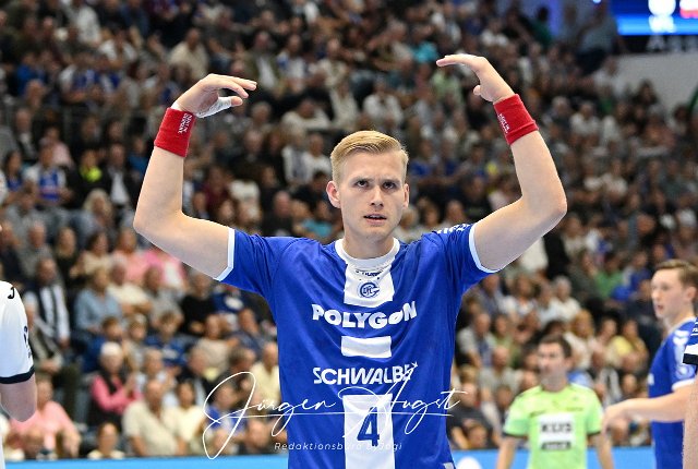 Ellidi Vidarsson (VfL Gummersbach 4) animiert die Fans in der Schwalbe Arena VfL Gummersbach vs. TBV Lemgo Lippe, Handball, Daikin 1. Bundesliga, 2. Spieltag, Spielzeit 2024-2025, Schwalbe Arena Gummersbach, 15,09.2024 Foto: Eibner-Pressefoto/Juergen Augst |