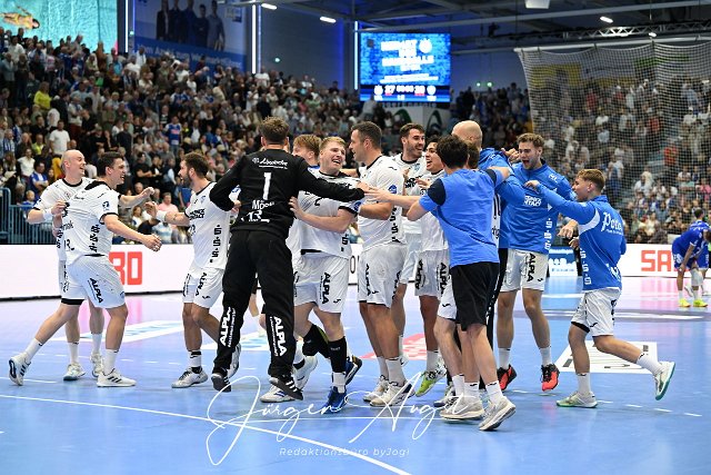 Constantin Moestl (TBV Lemgo Lippe 1) ud seine Mannschaftskameraden vom TBV Lemgo Lippe bejubeln den Auswaertssieg beim VfL Gummersbach VfL Gummersbach vs. TBV Lemgo Lippe, Handball, Daikin 1. Bundesliga, 2. Spieltag, Spielzeit 2024-2025, Schwalbe Arena Gummersbach, 15,09.2024 Foto: Eibner-Pressefoto/Juergen Augst |