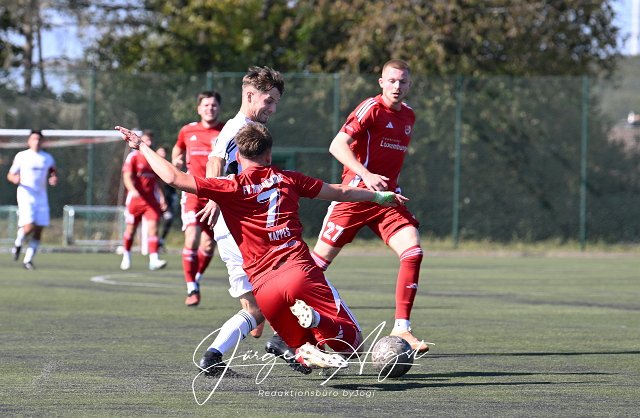 Fussball, Rheinlandliga, SG Malberg (weiß) vs. FV Hunsrueckhoehe (rot), 21.09.2024 |