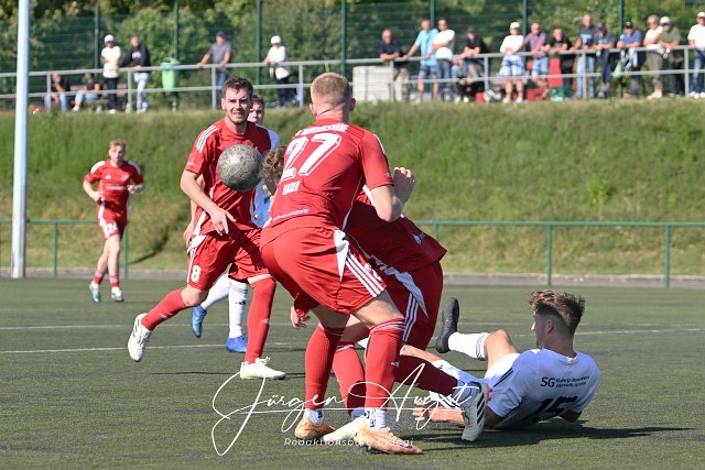 Fussball, Rheinlandliga, SG Malberg (weiß) vs. FV Hunsrueckhoehe (rot), 21.09.2024 |