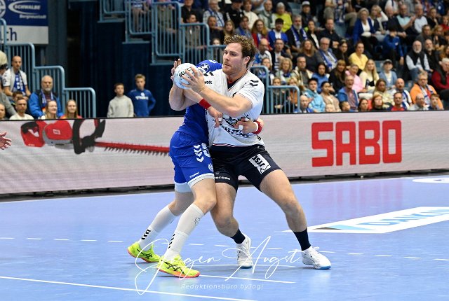 Johannes Golla (SG Flensburg-Handewitt 4) gegen Ellidi Vidarsson (VfL Gummersbach 4) VfL Gummersbach vs. SG Flensburg Handewitt, Handball, Daikin 1. Bundesliga, 5. Spieltag, Spielzeit 2024-2025, Schwalbe Arena Gummersbach, 06.10.2024 Foto: Eibner-Pressefoto/Juergen Augst |