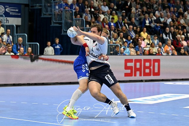 Johannes Golla (SG Flensburg-Handewitt 4) gegen Ellidi Vidarsson (VfL Gummersbach 4) VfL Gummersbach vs. SG Flensburg Handewitt, Handball, Daikin 1. Bundesliga, 5. Spieltag, Spielzeit 2024-2025, Schwalbe Arena Gummersbach, 06.10.2024 Foto: Eibner-Pressefoto/Juergen Augst |