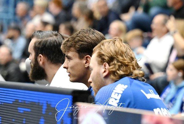 Verletztenbank des VfL Gummersbach Julian Koester (VfL Gummersbach 7), Tom Kiesler (VfL Gummersbach 30) und Teitur Einarsson (VfL Gummersbach 14) VfL Gummersbach vs. SG Flensburg Handewitt, Handball, Daikin 1. Bundesliga, 5. Spieltag, Spielzeit 2024-2025, Schwalbe Arena Gummersbach, 06.10.2024 Foto: Eibner-Pressefoto/Juergen Augst |
