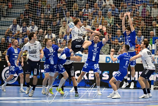 #2 Simon Pytlick (SG Flensburg-Handewitt 2) gegen Stepan Zeman (VfL Gummersbach 66) und Miro Schluroff (VfL Gummersbach 15) VfL Gummersbach vs. SG Flensburg Handewitt, Handball, Daikin 1. Bundesliga, 5. Spieltag, Spielzeit 2024-2025, Schwalbe Arena Gummersbach, 06.10.2024 Foto: Eibner-Pressefoto/Juergen Augst |