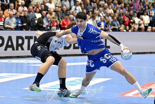 Giorgi Tskhovrebadze (VfL Gummersbach 19) gegen #25 Lukas Jorgensen (SG Flensburg-Handewitt 25) VfL Gummersbach vs. SG Flensburg Handewitt, Handball, Daikin 1. Bundesliga, 5. Spieltag, Spielzeit 2024-2025, Schwalbe Arena Gummersbach, 06.10.2024 Foto: Eibner-Pressefoto/Juergen Augst |