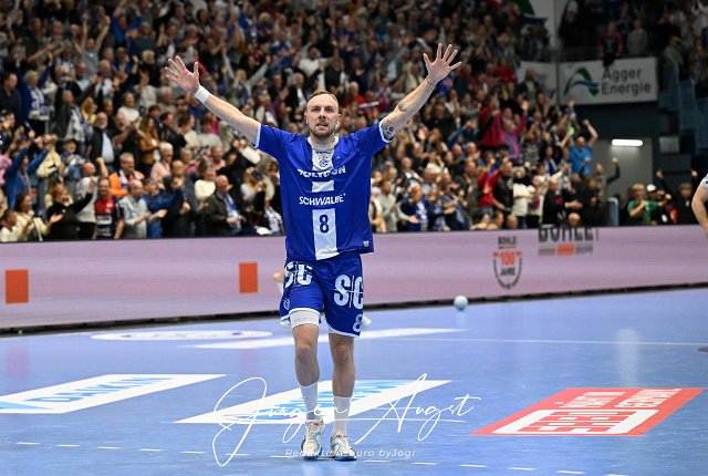 Lukas Blohme (VfL Gummersbach 8) bejubelt das Unentschieden gegen die SG Flensburg-Handewitt mit ausgebreiteten Armen VfL Gummersbach vs. SG Flensburg Handewitt, Handball, Daikin 1. Bundesliga, 5. Spieltag, Spielzeit 2024-2025, Schwalbe Arena Gummersbach, 06.10.2024 Foto: Eibner-Pressefoto/Juergen Augst |