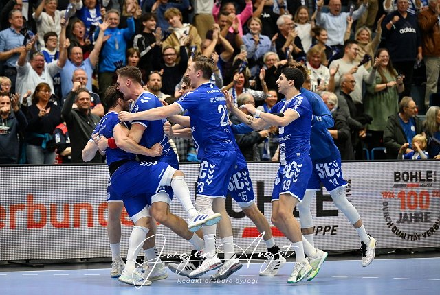 Die Spieler des VfL Gummersbach bejubeln das Unentschieden gegen die SG Flensburg-Handewitt wie einen Sieg VfL Gummersbach vs. SG Flensburg Handewitt, Handball, Daikin 1. Bundesliga, 5. Spieltag, Spielzeit 2024-2025, Schwalbe Arena Gummersbach, 06.10.2024 Foto: Eibner-Pressefoto/Juergen Augst |