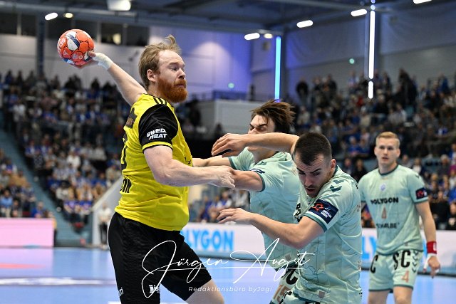 Magnus Persson (IK Saevehof 10) gegen Milos Vujovic (VfL Gummersbach 6) und Miro Schluroff (VfL Gummersbach 15) Handball, EHF European Handball Federation, 2024-2025, Gruppenphase, Hinspiel, VfL Gummersbach (GER) vs. IK Saevehof (SWE), Schwalbe Arena Gummersbach, .08.10..2024 Foto: Eibner-Pressefoto/Juergen Augst |