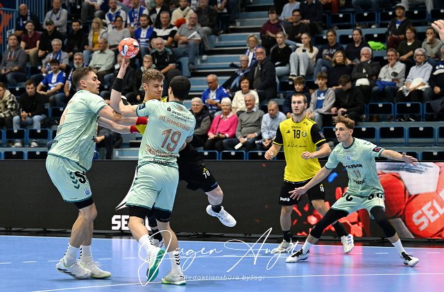 Oli Mittun (IK Saevehof 78) gegen Stepan Zeman (VfL Gummersbach 66) und Miro Schluroff (VfL Gummersbach 15) Handball, EHF European Handball Federation, 2024-2025, Gruppenphase, Hinspiel, VfL Gummersbach (GER) vs. IK Saevehof (SWE), Schwalbe Arena Gummersbach, .08.10..2024 Foto: Eibner-Pressefoto/Juergen Augst |
