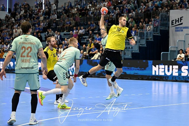 Pontus Brolin (IK Saevehof 18) kommt am Kreis frei zum Abschluss Handball, EHF European Handball Federation, 2024-2025, Gruppenphase, Hinspiel, VfL Gummersbach (GER) vs. IK Saevehof (SWE), Schwalbe Arena Gummersbach, .08.10..2024 Foto: Eibner-Pressefoto/Juergen Augst |