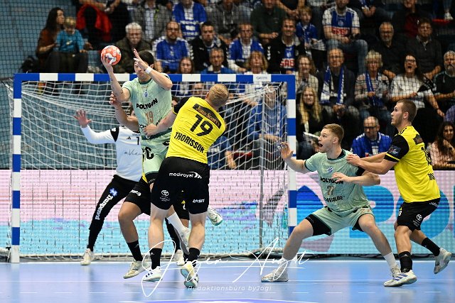 Giorgi Tskhovrebadze (VfL Gummersbach 19) gegen Tryggvi Porisson (IK Saevehof 19) und Adam Blanche (IK Saevehof 6) Handball, EHF European Handball Federation, 2024-2025, Gruppenphase, Hinspiel, VfL Gummersbach (GER) vs. IK Saevehof (SWE), Schwalbe Arena Gummersbach, .08.10..2024 Foto: Eibner-Pressefoto/Juergen Augst |