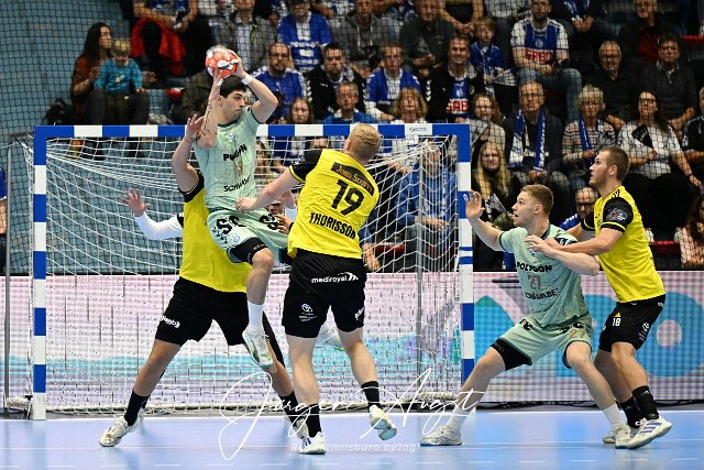Giorgi Tskhovrebadze (VfL Gummersbach 19) gegen Tryggvi Porisson (IK Saevehof 19) und Adam Blanche (IK Saevehof 6) Handball, EHF European Handball Federation, 2024-2025, Gruppenphase, Hinspiel, VfL Gummersbach (GER) vs. IK Saevehof (SWE), Schwalbe Arena Gummersbach, .08.10..2024 Foto: Eibner-Pressefoto/Juergen Augst |