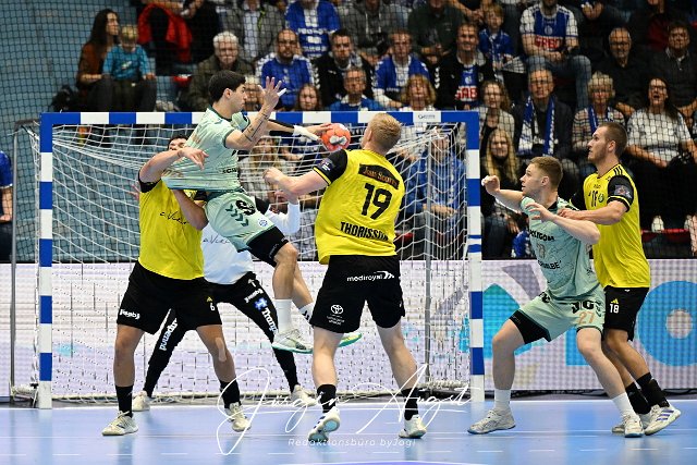 Giorgi Tskhovrebadze (VfL Gummersbach 19) gegen Tryggvi Porisson (IK Saevehof 19) und Adam Blanche (IK Saevehof 6) Handball, EHF European Handball Federation, 2024-2025, Gruppenphase, Hinspiel, VfL Gummersbach (GER) vs. IK Saevehof (SWE), Schwalbe Arena Gummersbach, .08.10..2024 Foto: Eibner-Pressefoto/Juergen Augst |